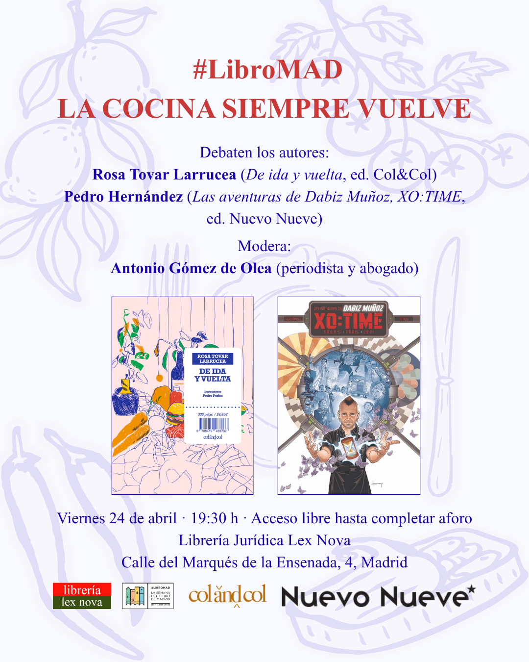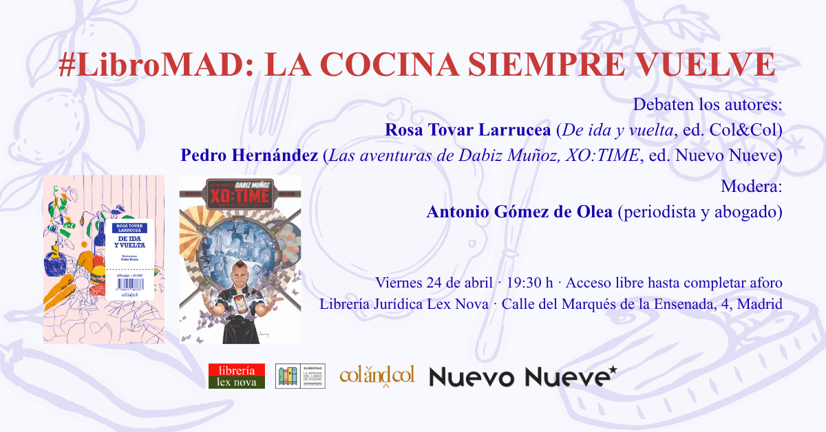 En Lex Nova nos unimos a la programación cultural del festival #LibroMAD con el tema «Los confines de los libros». Nuestra propuesta es un delicioso debate titulado «La cocina siempre vuelve». Participan los autores Rosa Tovar Larrucea (De ida y vuelta, ed. Col&Col) y Pedro Hernández (Las aventuras de Dabiz Muñoz, XO:TIME, ed. Nuevo Nueve). Modera el debate Antonio Gómez de Olea, periodista y abogado. El evento será el viernes ...