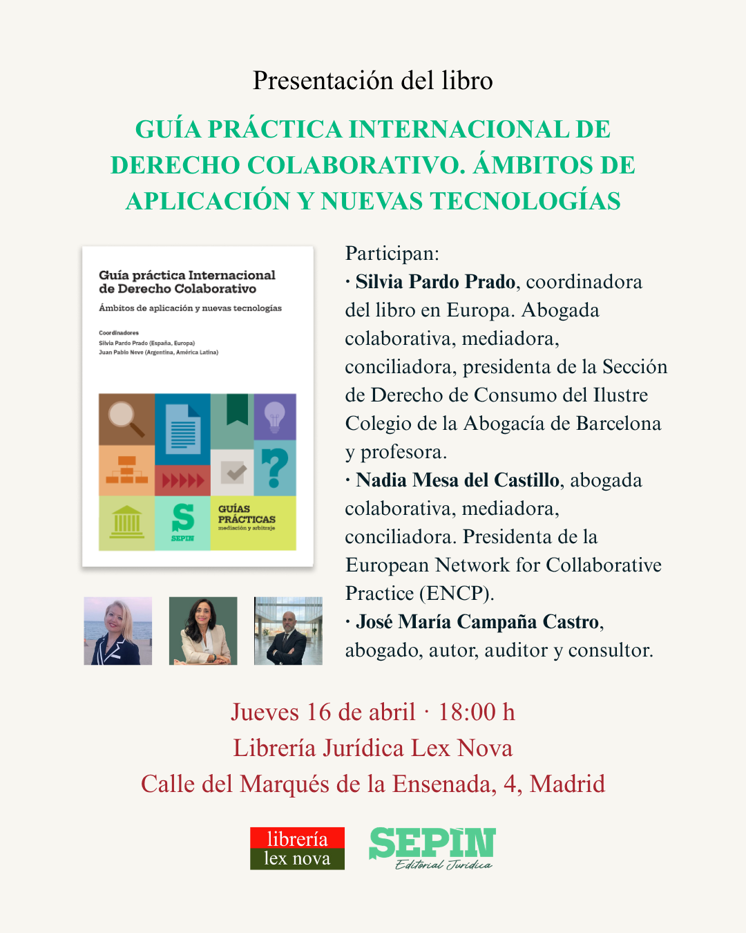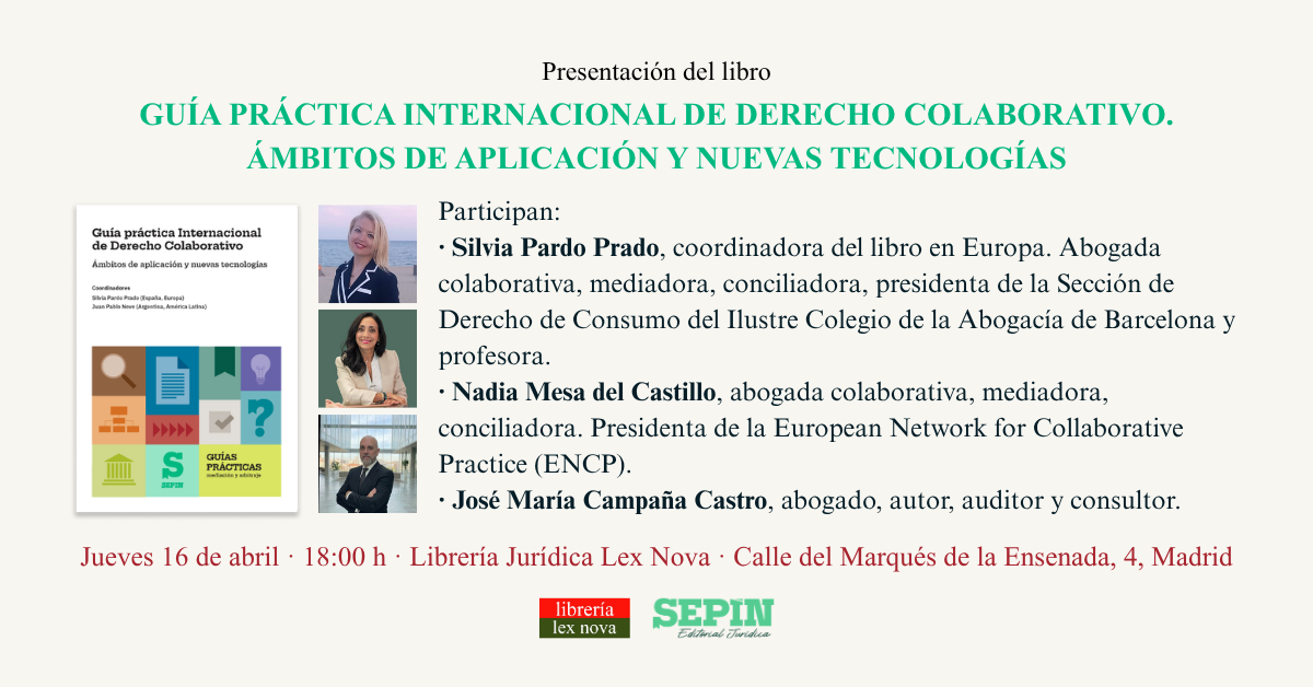 Les invitamos a asistir a la presentación del libro Guía práctica Internacional de Derecho Colaborativo. Ámbitos de aplicación y nuevas tecnologías, publicado por la editorial jurídica Sepín. Un libro práctico, actualizado e imprescindible para todo profesional comprometido con una justicia centrada en las personas, eficiente y sostenible. La presentación será el jueves 16 de abril a las 18:00 h en nuestra librería, situada en la calle del Marqués de la ...